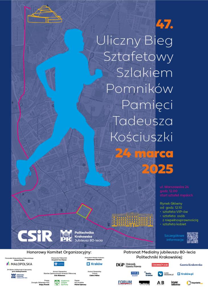 Uliczny Bieg Sztafetowy Szlakiem Pomników Pamięci Tadeusza Kościuszki – patrona naszej Uczelni, w tym roku wpisujący się w 80-lecie Politechniki Krakowskiej jako sztandarowa impreza sportowa jubileuszu, na trwałe zapisał się w pejzaż Naszego Miasta i jest bezprecedensową imprezą na skalę europejską, biorąc pod uwagę miejsce rozgrywania biegu (główne ulice Królewskiego Miasta Krakowa) i formułę w jakiej jest rozgrywany (kobiety – 4 x 1 okrążenie wokół Rynku; mężczyźni – sztafeta 5-cio osobowa rywalizująca na trasie ul. Warszawska – Kopiec Kościuszki). W jego ramach odbywa się także Bieg VIP -1 okrążenie wokół Rynku Głównego, która przyciąga znane osobistości Królewskiego Miasta Krakowa oraz znacząco przyczynia się do propagowania aktywnego trybu życia, a także Bieg Osób z Niepełnosprawnościami – 1 okrążenie wokół Rynku Głównego tradycyjnie organizowany we współpracy Biurami ds. Osób z Niepełnosprawnościami krakowskich uczelni.