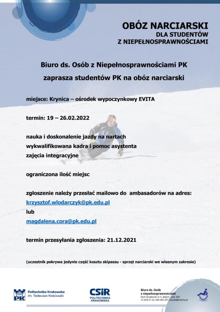 Wyjazd na narty dla osób niepełnosprawnych Informujemy, że Politechnika Krakowska zaangażowana jest w szereg innych działań promujących aktywność fizyczną. W miesiącach zimowych organizowany będzie wyjazd na narty dla osób niepełnosprawnych. Wszelkie szczegóły znajdują się na plakacie.